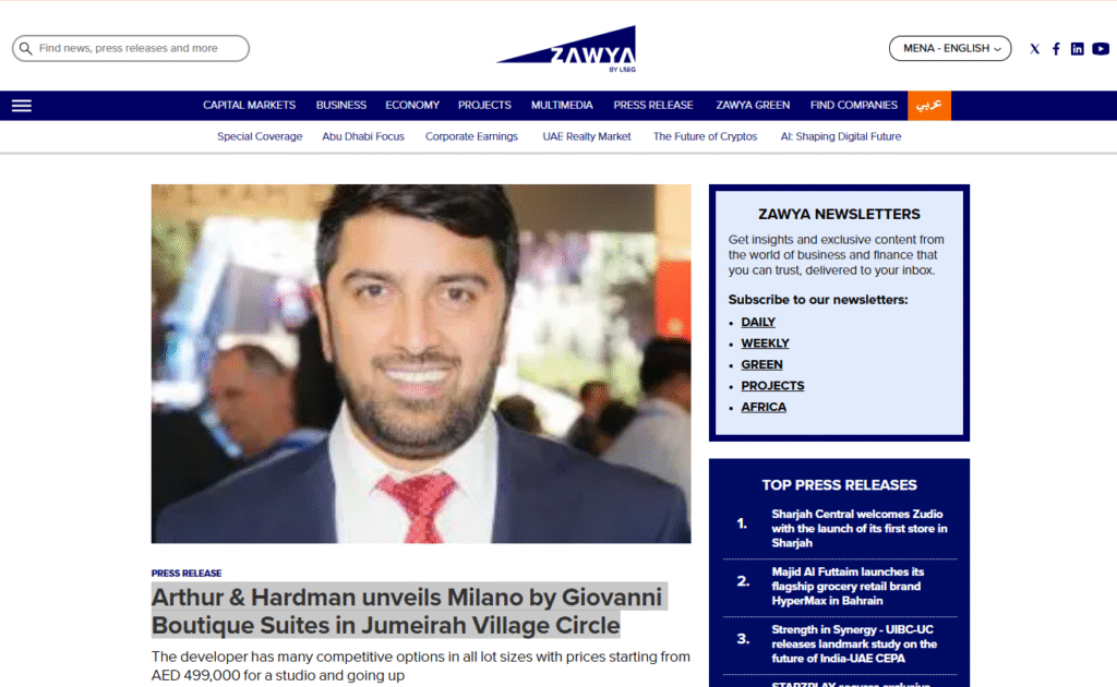 Arthur & Hardman unveils Milano by Giovanni Boutique Suites in Jumeirah Village Circle