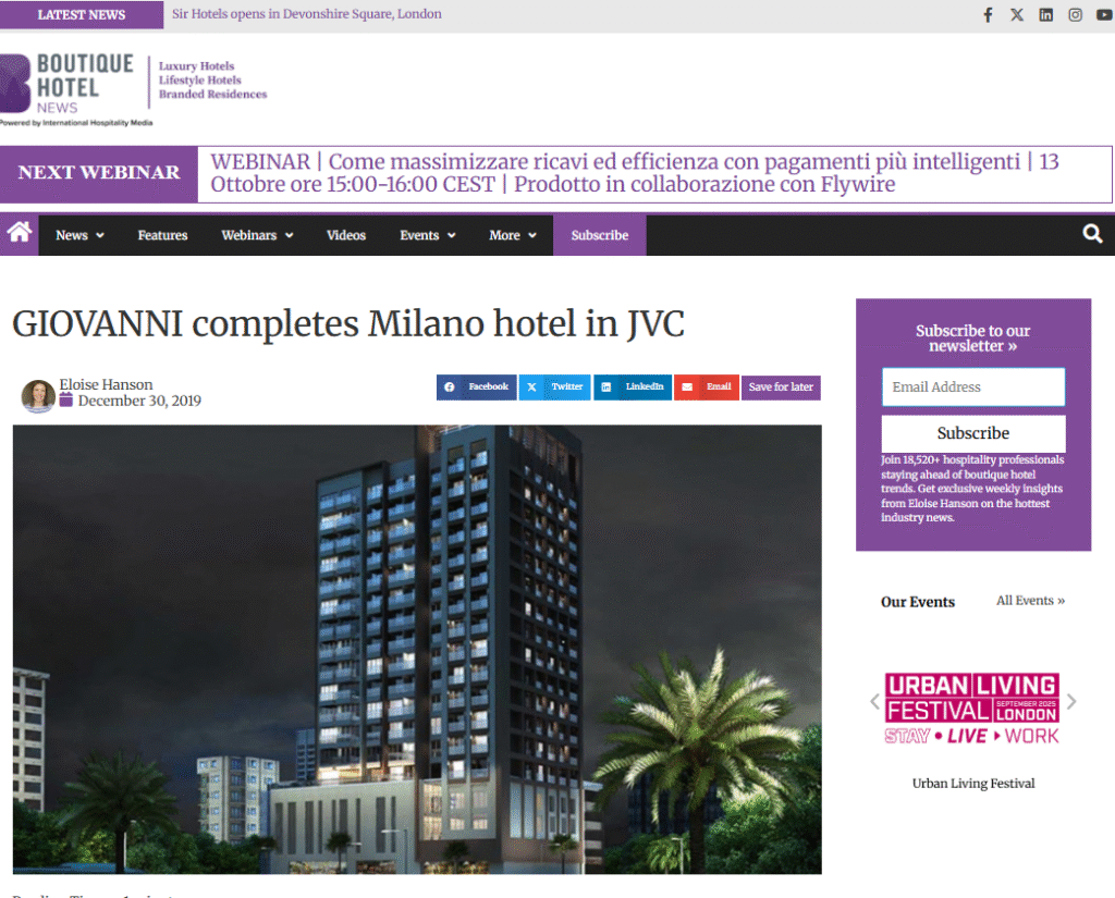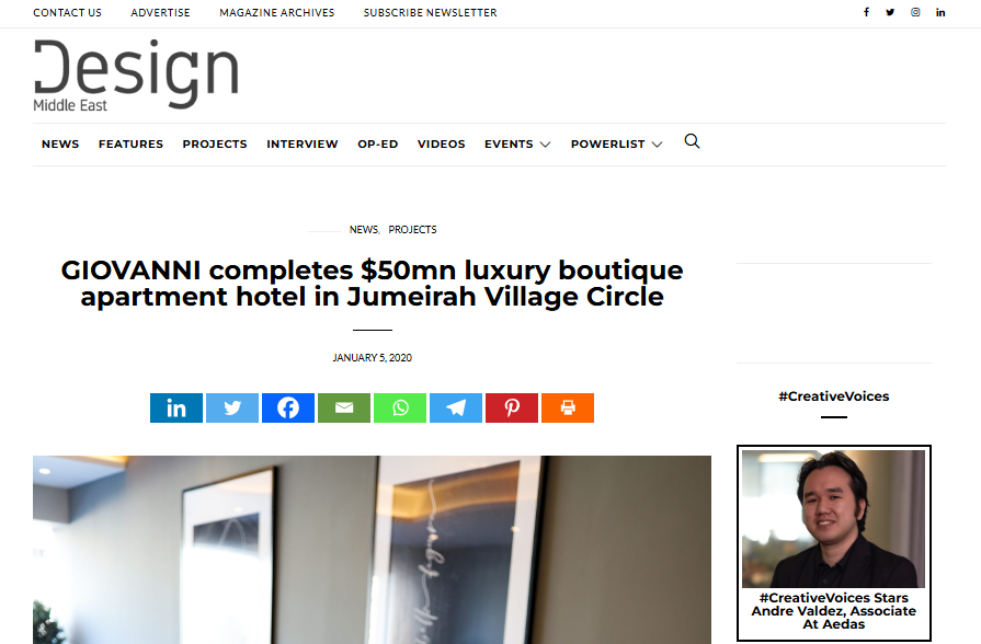 GIOVANNI completes $50mn luxury boutique apartment hotel in Jumeirah Village Circle